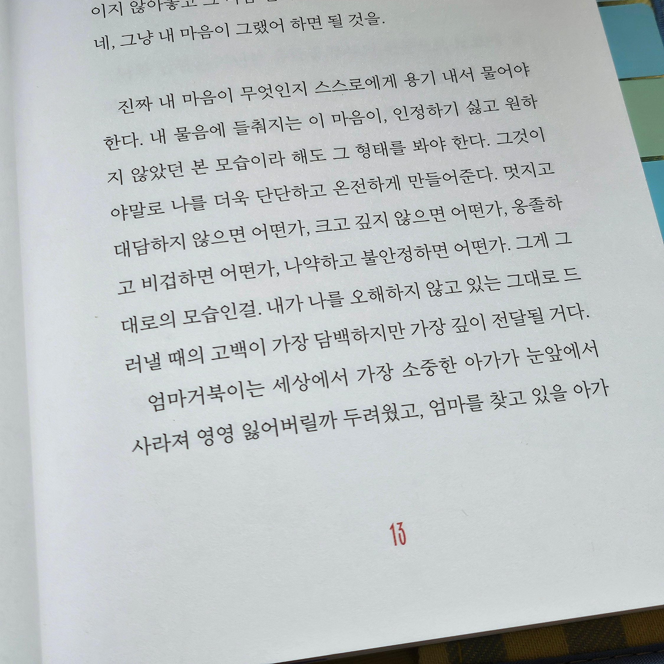 진짜 내 마음이 무엇인지 스스로에게 용기 내서 물어야 한다. 내 물음에 들춰지는 이 마음이, 인정하기 싫고 원하지 않았던 본 모습이라 해도 그 형태를 봐야 한다. 그것이야말로 나를 더욱 단단하고 온전하게 만들어준다. 멋지고 대담하지 않으면 어떤가, 크고 깊지 않으면 어떤가, 옹졸하고 비겁하면 어떤가, 나약하고 불안정하면 어떤가. 그게 그대로의 모습인걸. 내가 나를 오해하지 않고 있는 그대로 드러낼 때의 고백이 가장 담백하지만 가장 깊이 전달 될 거다. _13p