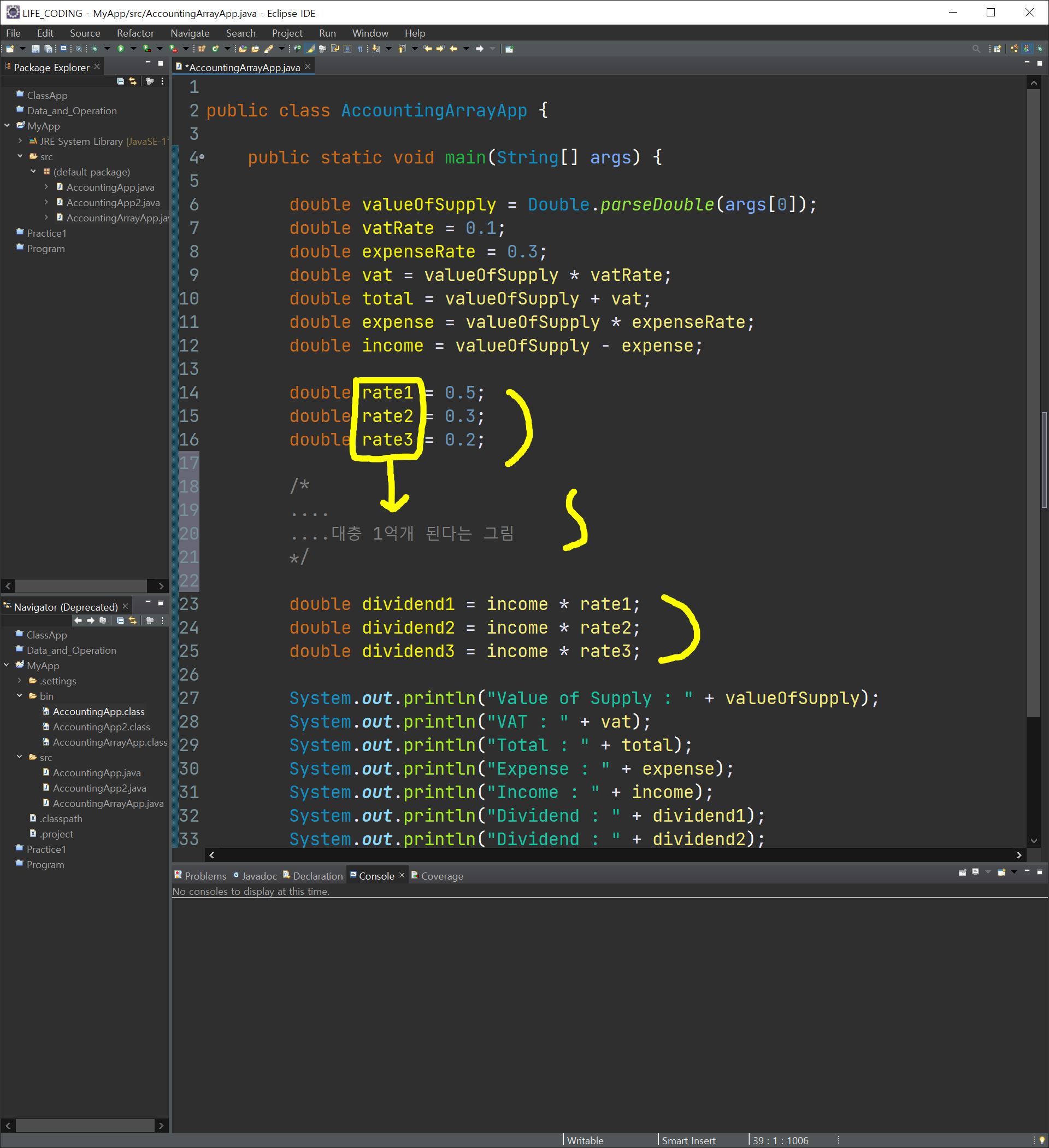 바로 위에서 배열을 통해 세 명의 배당을 그릇에 담아 안전하게 활용하는 부분이 있었지만