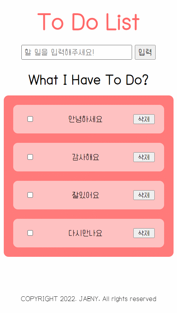 [개인 프로젝트] Vanilla JS로 To Do List 만들기 (1) (0) | 2022.08.28 |