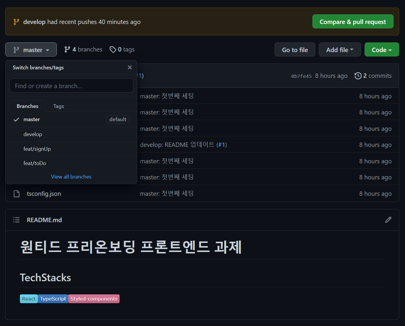 복잡하지 않도록 master, develop, feature만 가져가기로 했다.